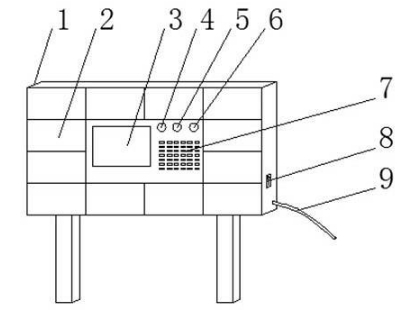 殼體的正面安裝有光帶顯示屏、顯示器以及控制按 鍵;控制按鍵的上方安裝有狀態指示燈、預警指示燈以及故障指示燈;殼體的一側 設有電源開關和電源線,殼體的底端鉸接有支腳,殼體的背面設有凹槽,凹槽的上方固定有安裝條,且安裝條上設有安裝孔,所述輸入模塊的輸出端與中央控制器的輸入端電性連接,中央控制器的輸出端分別與光帶顯示模塊、顯示器、指示燈模塊、蜂鳴報警器、報表打印模塊以及電流電壓顯示模塊的輸入端電性連接,中央控制器通過無線通信模塊與上位機連接。光帶顯示屏可拆卸安裝在殼體上;顯示器位于殼體的中間位置處,光帶顯示屏安裝在顯示器的四周;凹槽位于支腳的正上方,且凹槽的尺寸大于支腳的尺寸;在殼體上可拆卸的安裝有光帶顯示屏,在殼體的底端鉸接有支腳,且殼體的背面設有可放置支腳的凹槽,便于該模擬板的運輸的攜帶,同時由于顯示器位于殼體的中間位置處,光帶顯示屏安裝在顯示器的四周,便于監控,實用性強,在殼體的背面固定有安裝條,便于該模擬板的安裝固定,該模擬板 可通過無線通信模塊與上位機連接,智能化程度高,便于控制,使用方便。構造如圖: