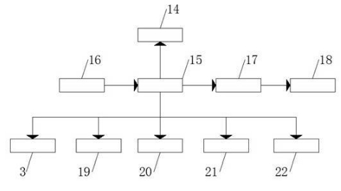1- 殼體 ;2- 光帶顯示屏 ;3- 顯示器 ;4- 狀態指示燈 ;5 預警指示燈 ; 6- 故障指示燈 ;7- 控制按鍵 ;8- 電源開關 ;9- 電源線 ;10- 安裝條 ;11- 安裝孔 ;12- 凹槽 ; 13- 支腳 ;14- 光帶顯示模塊 ;15- 中央控制器 ;16- 輸入模塊 ;17- 無線通信模塊 ;18- 上位 機 ;19- 指示燈模塊 ;20- 蜂鳴報警器 ;21- 報表打印模塊 ;22- 電流電壓顯示模塊。